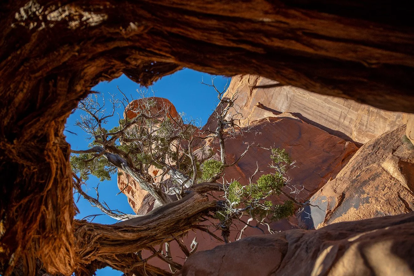 In the desert, composition is easy to find, however good composition is challenging to frame. These two shots, one of a green tree between a red-rock gorge and the other of the badlands and their bushes illustrate the desert’s wonder.